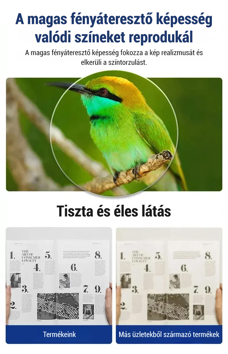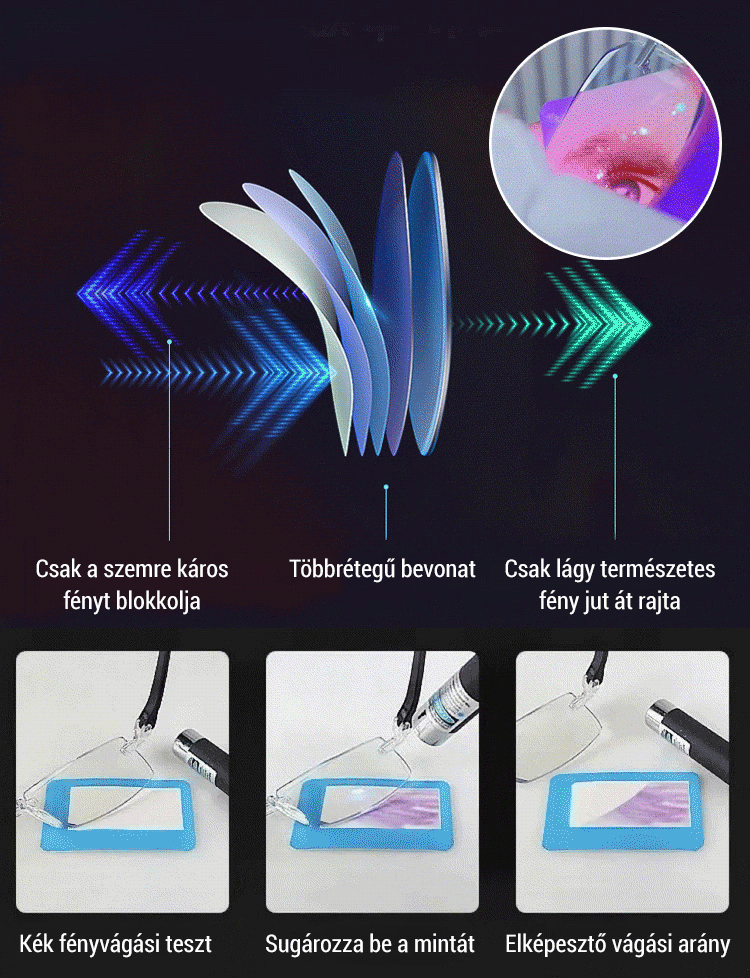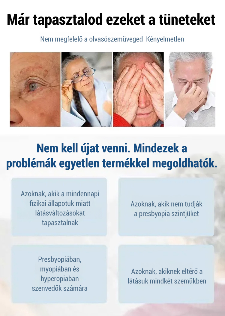 Nincs szükség szemvizsgálatra; automatikusan alkalmazkodik a 100 és 700 dioptria közötti dioptriaértékekhez. A felhasználók 98%-a számolt be javuló látásról.