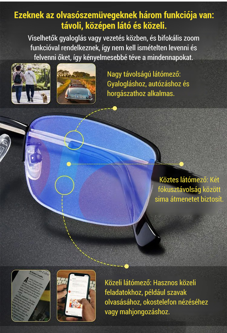 Multifunkciós szemüveg – Mondjon búcsút a lencsecsere macerájának! Ez a szemüveg mindenhez tökéletes: számítógépes munkához, olvasáshoz és szabadtéri tevékenységekhez!